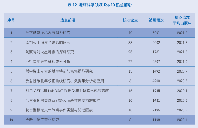其中2024 年地球科学领域Top10 热点前沿学科4个热点前沿属于地质学,地理学、 大气科学和行星科学各2个,总体聚焦新能源发展与全球气候变化。