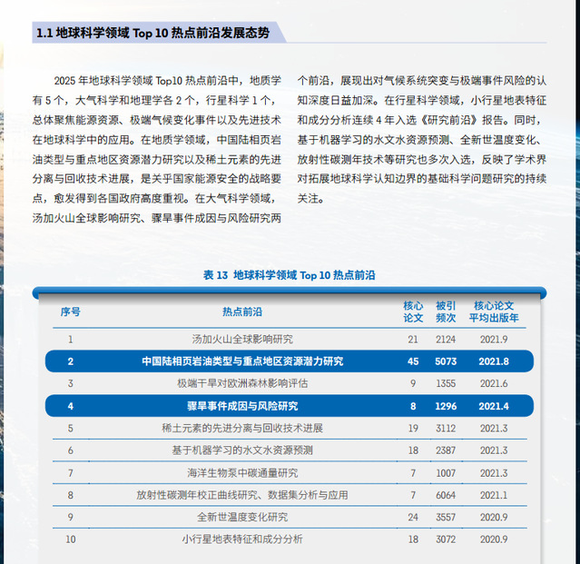 2025 年地球科学领域 Top10 热点前沿中,地质学有 5 个,大气科学和地理学各 2 个,行星科学 1 个,总体聚焦能源资源、极端气候变化事件以及先进技术在地球科学中的应用。在地质学领域,中国陆相页岩油类型与重点地区资源潜力研究以及稀土元素的先进分离与回收技术进展,是关乎国家能源安全的战略要点,愈发得到各国政府高度重视。